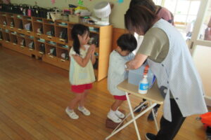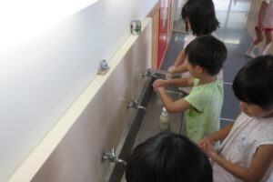 子ども達も、外あそびやトイレや食事など、いろいろな場面で、バイキンマンをやっつけようと手洗いを頑張っています。