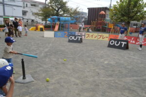 バッティングゲームやボールなげの遊びをして、みんなで野球に楽しくふれあいました。