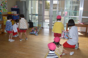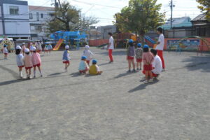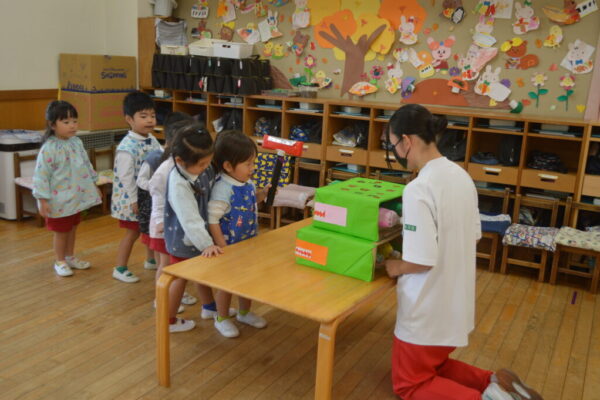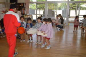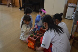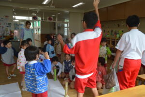 吉原第一中学校の生徒が、幼稚園の子ども達と交流を持ちに遊びに来てくれました。家庭科の授業で子ども達が楽しめそうな遊びやゲームを考えてきてくれて、子ども達は大喜び。