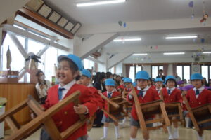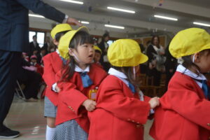 新しいクラス帽子を被り、進級式に入場です。