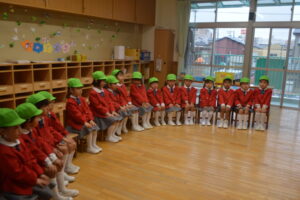 新しいクラス帽子をもらい、入園式へ。